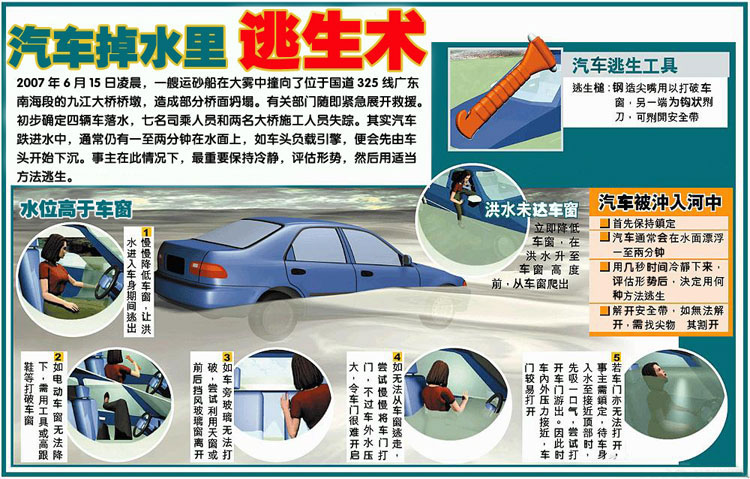 事发:广东九江大桥被运砂船撞断,4车堕江 6月15日凌晨5时许,广东佛开高速公路公司管辖的九江大桥被一艘运沙船撞断,初步认定4辆汽车坠江9人失踪,4辆车是佛山的粤Y小货车、粤A牌小货车(此前公布的“套牌车”是官方信息发布资料错误)、深圳的粤B大货车以及江门的粤J邮政车,4车上共有7人失踪。 广东佛山九江大桥断裂(来源:CFP) 4车落水 为何无人逃生 国内外此前都有不少汽车落水成功逃生的案例,为何4辆汽车至今无一人成功逃生呢?首先事发地点九江大桥桥面较高,从现场图片来看,根据参照九江大桥16米的宽度进行目测,堕江桥面原高度应在30米以上。即使仅以30米的高度计算,车辆堕江时相对水面的垂直速度就已经达到了约25米/秒,约合90公里/小时。打个比方,30米大约相当于10层楼的高度,扔一辆车下来——即使扔到水里,有不坏的吗? 一般车辆碰撞测试中,64公里时速已经是较高的标准——尤其是来自车身下方的剧烈撞击在一般车辆设计时都不会考虑进去,而这很可能直接令乘员出现脊椎损伤而无法动弹甚至死亡。而且落水地点距江岸较远,广东地区最近一周降水量颇大,水流湍急,人员即使落水生还,要游到岸边难度也比较大——事实上,湍急的水流也严重阻碍了后来的打捞工作。 车辆落水如何自救 水下逃生示意图 要生存就要浮出水面!车辆落水自救攻略 最重要的一点,离开车辆,然后是设法浮上水面,做不到这两点的话,生还可能性基本为0。 步骤1:保持清醒的头脑 汽车刚落水后,在车内的千万不要惊慌,迅速辨明自己所处的位置,确定逃生的路线方案。 步骤2:尽量从车后座逃生 汽车入水过程中,由于车头较沉,所以应尽量从车后座逃生(客车的话直接从最近或者最上方的窗口逃生)。 步骤3:尝试打开车门 如果车门不能打开,手摇的机械式车窗可摇下后从车窗逃生;对于目前多数电动式车窗(很可能已经短路无法打开),如果入水后车窗与车门都无法打开,这时要保持头脑清醒,将面部尽量贴近车顶上部,以保证足够空气,等待水从车的缝隙中慢慢涌入,车内外的水压持平衡后,车门即可打开逃生。 步骤4:砸窗离开车辆 如果车门和车窗确实无法打开的话,也可以采用砸窗的办法,工具应选用尖嘴槌/高跟鞋或类似物品猛砸车辆侧窗。注意两点:a,挡风玻璃是砸不穿的;b,侧窗破碎时碎玻璃会连水冲入车内,注意避免划伤。离开车的时候,尽量保持面朝上,这样通常比较顺利。如果汽车有天窗的话,也可以选择砸碎或推开天窗逃生,特别是在车辆未沉没的时候,从天窗逃生是最好的路径。 步骤5:应尽快浮上水面 如果你不会游泳的话,离车前应在车内找一些能浮的物件抓住。如果有条件,可找大塑料袋套在头上(注意不要漏气,没把握的话就不要了),脖子匝紧,塑料袋内的空气可以够你上浮的氧气。 不可超速驾驶 虽然桥梁普遍路面宽阔笔直,但是如果车速过高的话,出现类似情况也很有可能因为刹车不及而落水。因为车辆的刹车距离基本上是与车速的平方成正比的(匀加速运动公式:V^2=2aS),也就是说100公里时速刹车距离为40米的车在150公里时速下就要大约90米——多出的50米距离已经足够10车连环相撞的总长度了,而在九江大桥上就意味着你有足够的空间直接掉头开走了。